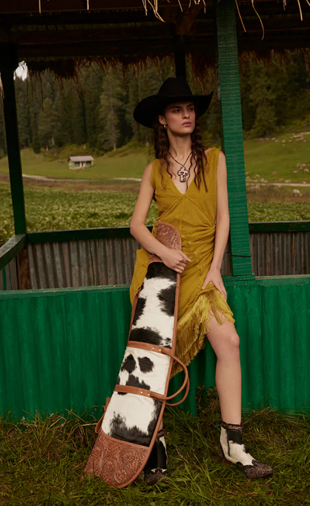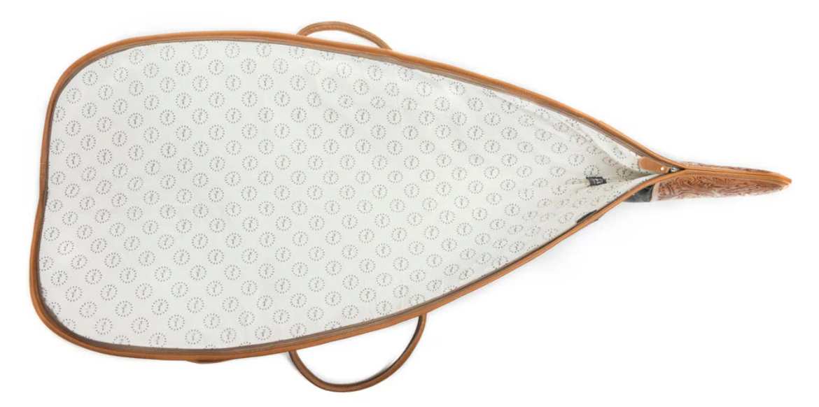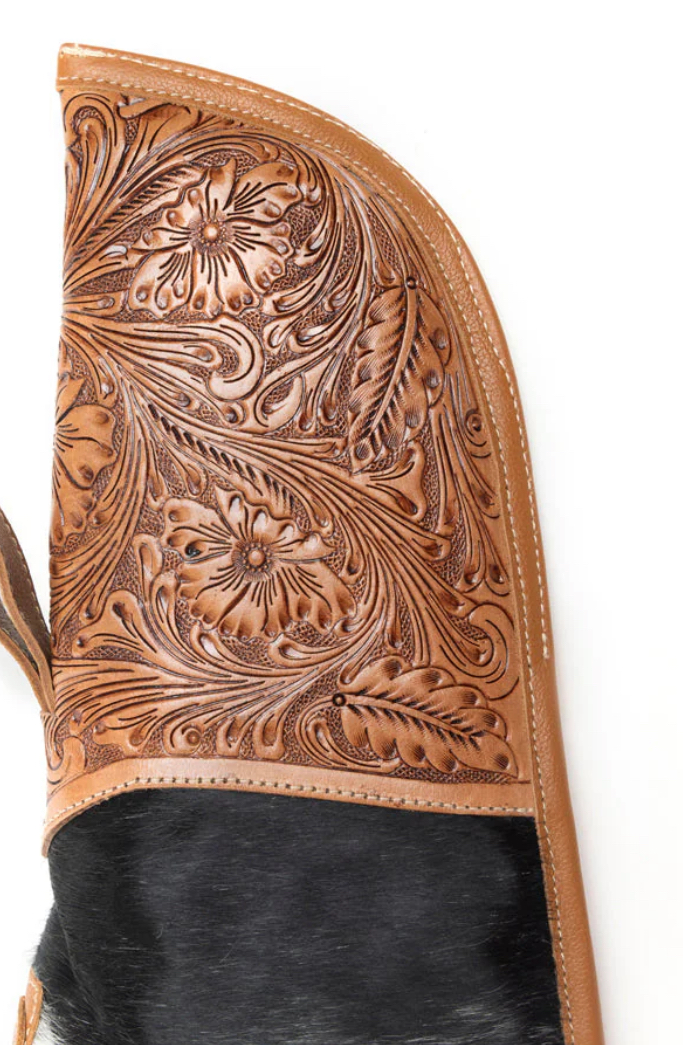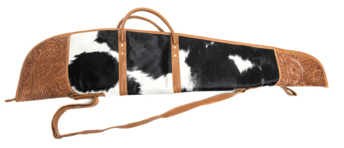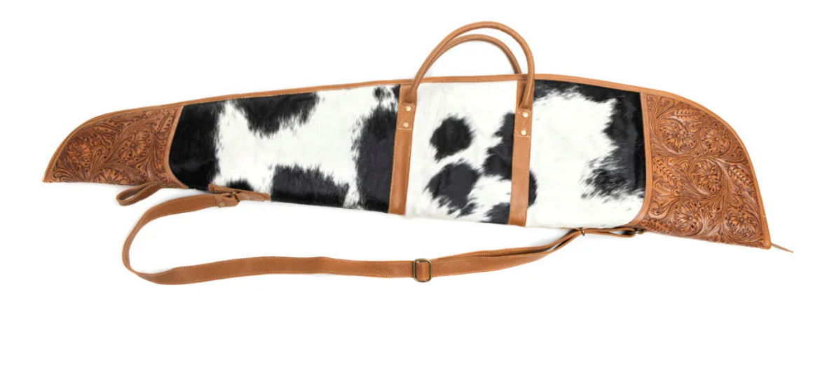 Precision craftsmanship and style this make this rifle case a standout. It will protect and carry your rifle or long gun securely. Black and white hair-on hide is accented with a beautiful panel of hand-tooled leather; the whole case is accented and trimmed in caramel brown leather, stitched to perfection. Wrap-around zipper. The detachable, adjustable shoulder strap and carrying handles are in matching leather. A magnificent case in all regards.