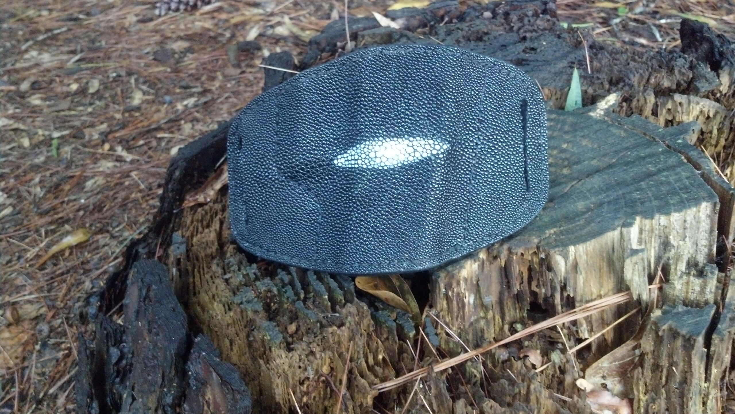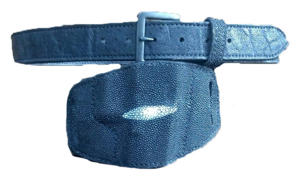 The Premium Stingray Gun Belt is made from premium stingray leather. When constructing the gun belt, MTR uses 1 piece of grade A medium ounce leather and one peice of grade A stingray leather. By using two pieces of leather instead of one helps to decrease the short term of the belt rolling over in the back, stretching at the holes and wearing out fast. Using two pieces of leather aids in the function of drawing your weapon fast. Your holster will stay nice and tight onto the belt and not raise up when drawing the weapon from a holster. By having a stiff belt that secures your holster tightly will increase your concealment of the weapon. MTR Custom Leather gun belts are ¼” thick. Which is thickness a gun belt should be when carrying. MTR uses a professional slicking technique that brings the two pieces of leather into one on the edge. This helps to slide the holster and accessories onto the belt easier. Also, with the professional slick edges on the gun belt helps for long term of the edges not splitting. MTR Custom Leather uses heavy duty nylon thread instead of cotton thread. Nylon thread is a lot more durable and stronger. The belt buckle is held together by 2 Chicago screws.